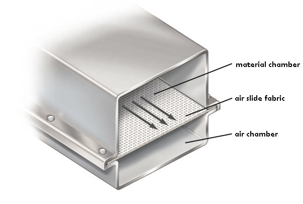 An Airslide belt is in the middle of a chute. Powder material will come into the chute above Airslide belt. Material will flow to the chute lower side as pneumatic blower down Airslide belt. That's why we say Airslide belt can move powder material because of the wind power. And then, the rest wind will go out from the top of the chute. Through the moving, no parts moved except powder material. So that it can spare more energy and maintain cost, etc.